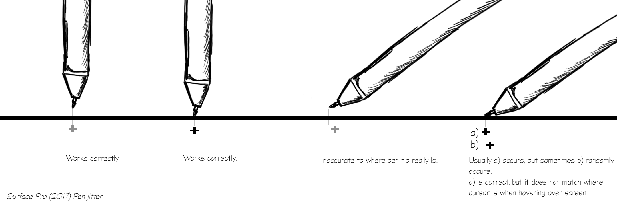 And unfortunately, the pen’s features can cause some issues, I think primarily caused by the presence of tilt. It has been well documented by now that the newest Surface pen is subject to random jitter, which can be noticeable if you need to draw with high precision. It happens randomly, sometimes there and sometimes not, but when it does happen it seems to be averaging the pen’s position based on its tilt. If you always draw with the pen perpendicular to the screen, or if you draw with your canvas zoomed in to the max, this isn’t a serious problem, but otherwise it can be a nightmare to artists, and if you need to select a button only a few pixels wide, it is simply no longer possible with the pen. The below diagram covers my personal experience with it. For most professional artists, this is a real deal-breaker, and since it has been almost a year since it was first found by users and acknowledged by Microsoft without a fix, it is unlikely to be resolved until a future Surface Pro 6 is made. Based on online opinions, third-party pens that do not support tilt are most likely to resolve the issue, although some might find cheaper fixes based on where they hold their hand, as if static electricity has something to do with it. You could also try to find a cheaper Surface Pro 3 or 4, which never had such a problem with the pen.