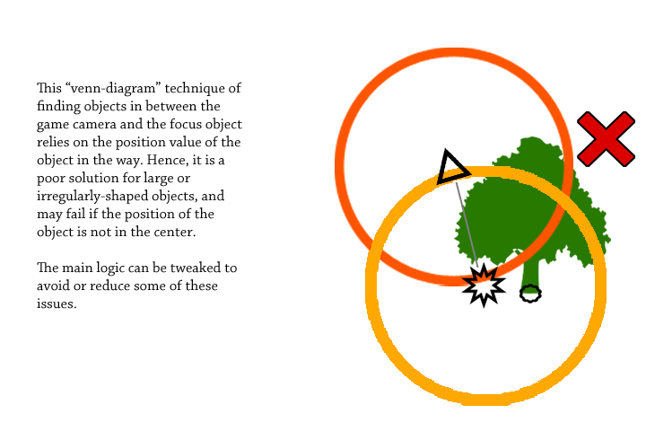 Remember venn diagrams? In math class, they were simple representations to show what properties between different things were shared and which were separate. You could draw two circles that connected with each other, and the shared properties would go in that shared space in the middle. In my case, I’m talking about using them for a different purpose: suppose you knew the distance between the camera and the player? Draw two circles, one with the player at the center, one with the camera at the center, the radius for each being the distance between the player and the camera. There should be a big shared space directly in between the player and the camera. If we can determine if any objects are in that space, then we’re set!