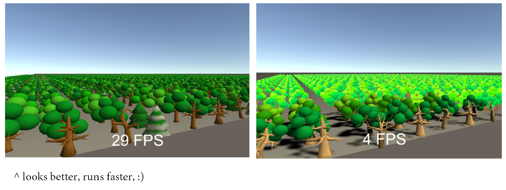 Tree models improved. Ignore the lack of shadows, I swear it didn’t affect the performance comparison in this case.