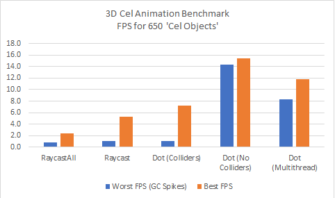 My testing results showed “Vector3.Dot” was actually a bit worse than “Physics.Raycast,” and a bit better than “Physics.RaycastAll,” but also had more opportunity for optimization than the built-in raycasting did. But my test environment had one major flaw: I had hundreds of “Cel Objects” to test on, but none of them were moving!