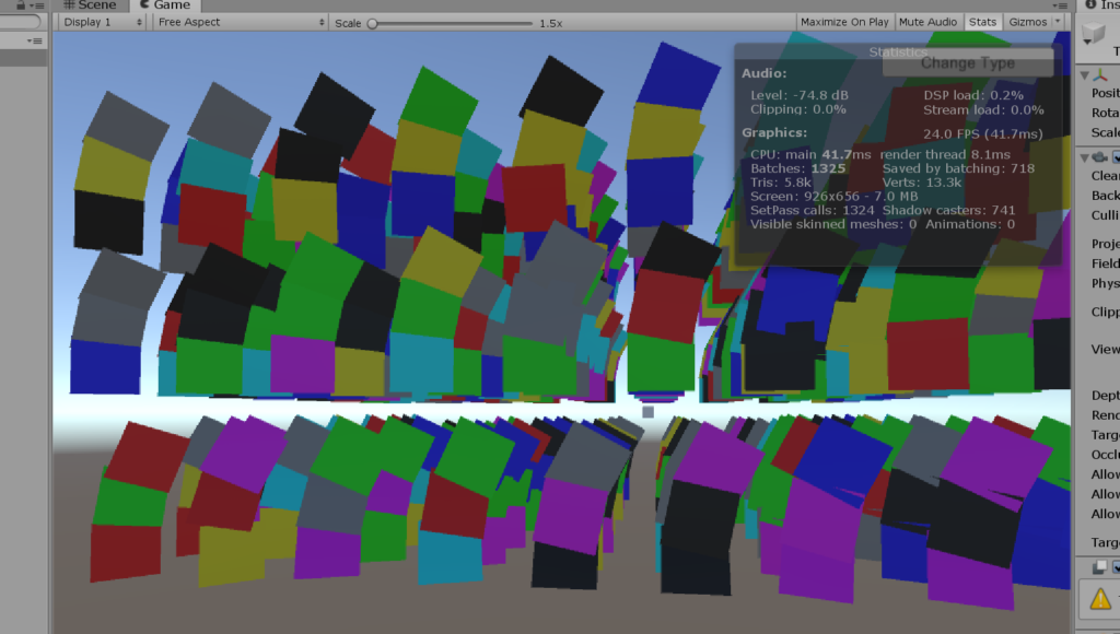 Here’s the curious thing: even though Test 4 seemed to have relatively consistent performance (not as many dips; all the others had some garbage collection to take care of, even Test 5), Test 4 appeared to be a little jerky to the naked eye. In comparison, Test 4, with multi-threading, always appeared smooth. It contradicts what the numbers say, but that’s what my eyes told me. Maybe a lesser load on the main thread worked for the best after all? Or maybe I just turned “vsync” off in the editor for observing raw performance, and this was some odd screen-tearing for cases that were almost-but-not-quite 30fps. Anyway, if you’re worried about your game looking smooth… maybe the “Job System” is worth a try.