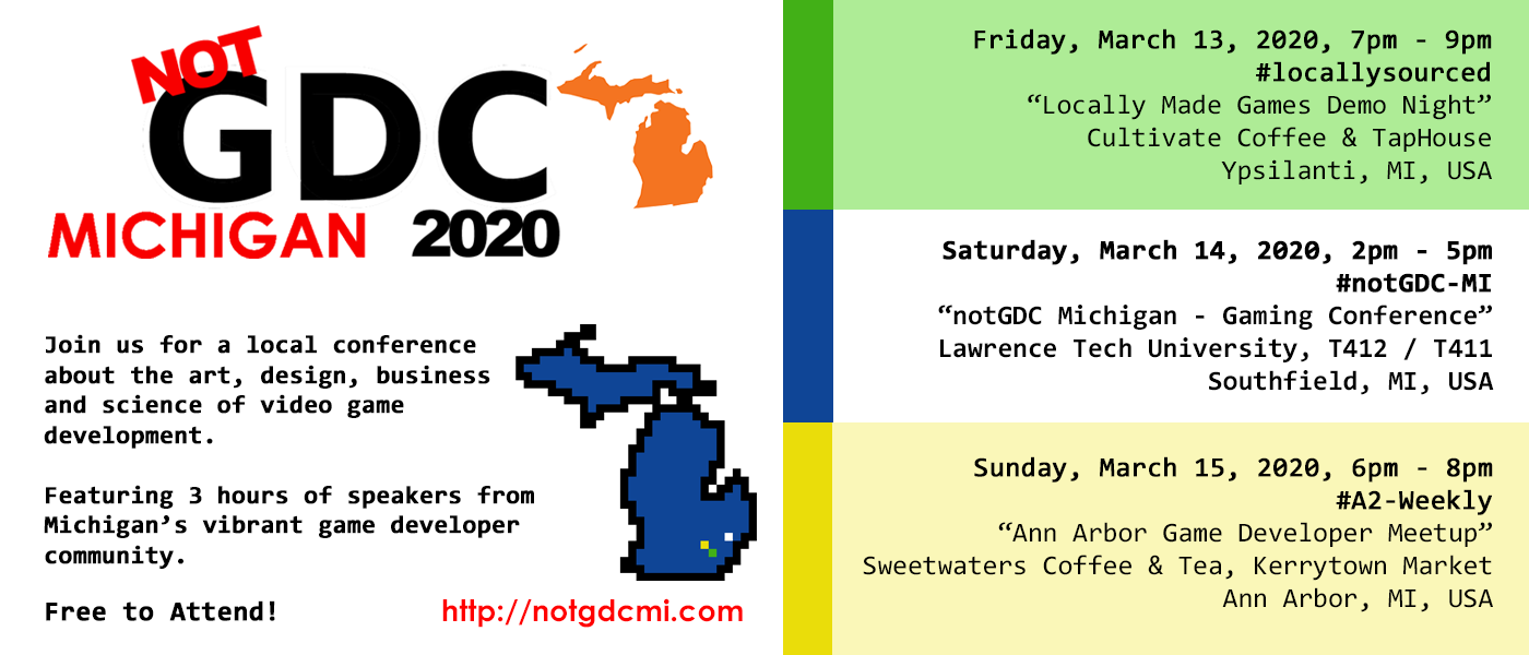 UPDATE (2020-03-13): In the last 48 hours, Michigan confirmed cases of COVID-19 being present. Schools canceled classes. Events of over 100 people are generally canceled, or banned. We had updated “notGDC Michigan” to be online-inclusive, and then online-exclusive when the original location became uncertain. Finally, we regretfully canceled “notGDC Michigan” today. It won’t be held on Saturday, March 14, 2020, but will hopefully be held later this year. It’s frustrating to cancel an event only 24 hours in advance, but for the safety and interest of the local community, it was necessary. Original article remains below.