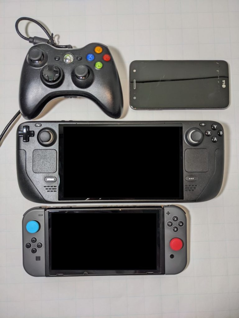 Here’s a bunch of pictures comparing the size of the device to a Nintendo Switch, an Xbox controller, a 12.3″ Surface Pro, and an old 5.5″ smartphone.